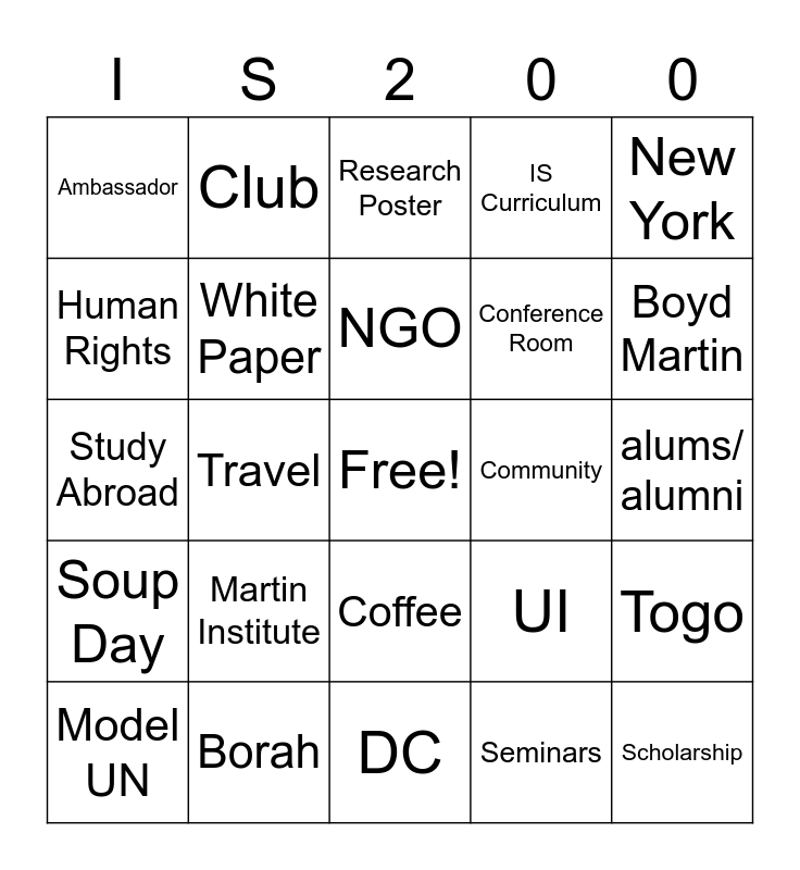 This bingo card has a free space and 24 words: Martin Institute, Borah, NGO, Model UN, New York, Ambassador, Human Rights, Club, Community, Coffee, Conference Room, Study Abroad, UI, Togo, White Paper, Seminars, alums/ alumni, Research Poster, Boyd Martin, Travel, Scholarship, Soup Day, IS Curriculum and DC.