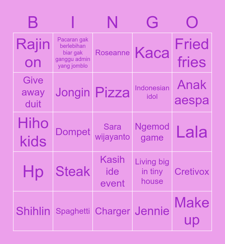 This bingo card has a free space and 24 words: Steak, Spaghetti, Pizza, Shihlin, Fried fries, Rajin on, Give away duit, Pacaran gak berlebihan biar gak ganggu admin yang jomblo, Ngemod game, Kasih ide event, Indonesian idol, Hiho kids, Living big in tiny house, Cretivox, Jongin, Jennie, Lala, Roseanne, Anak aespa, Dompet, Make up, Hp, Kaca and Charger.