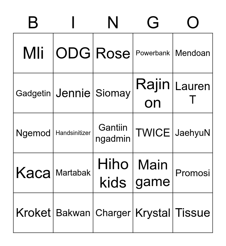 This bingo card has a free space and 24 words: Martabak, Bakwan, Siomay, Kroket, Mendoan, Mli, Gadgetin, ODG, TWICE, Hiho kids, Rajin on, Ngemod, Main game, Promosi, Jennie, Krystal, JaehyuN, Rose, Lauren T, Handsinitizer, Tissue, Kaca, Powerbank and Charger.
