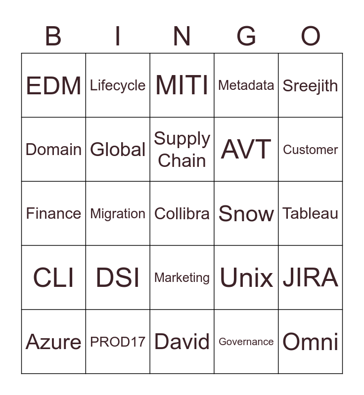 This bingo card has 45 words: Data, Collibra, GDO, Azure, Mangal, Governance, MITI, Atomic, Sreejith, PROD17, Metadata, Snow, Marketing, DSI, Engg, David, Dev, Finance, Reports, Customer, Lifecycle, GCP, Ranger, EDM, GDP, Tableau, PowerBI, Python, Unix, CLI, Scrum, JIRA, User story, Data Discovery, Analysis, Migration, Store, Dotcom, Omni, Supply Chain, Domain, AVT, Teradata, Global and WW/US.