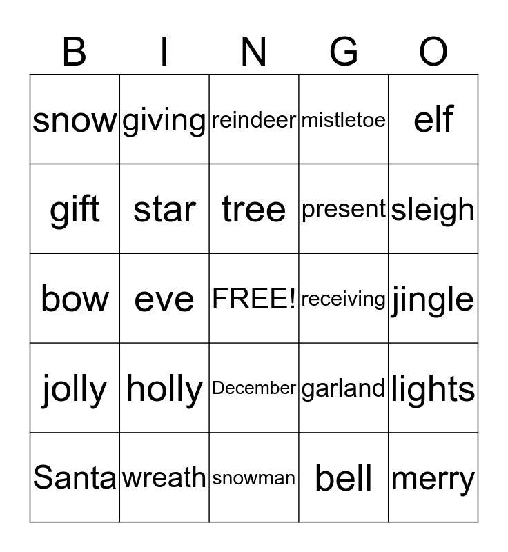 This bingo card has a free space and 24 words: holly, wreath, tree, Santa, elf, snow, gift, giving, receiving, December, present, bow, garland, lights, star, bell, jingle, reindeer, sleigh, eve, merry, jolly, mistletoe and snowman.