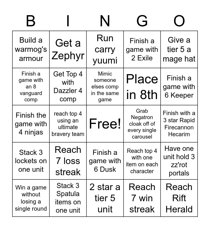 This bingo card has a free space and 73 words: Keep a unit from the start until the end, Win with a team with only tier 5 units, Build a warmog's armour, Finish a game on a Fortune 6 comp, Get a 4 Star unit (Moonlight), Max out two traits in a team, Stack 3 lockets on one unit, Finish a game with Duelist 8 comp, Reach top 4 with one item on each character, Get a draw in a match, Finish a game on a Hunter 5 comp, Build items for only your supports *, Get Top 4 with Dazzler 4 comp, Finish with a 3 star Rapid Firecannon Hecarim, Get bottom 4, Get a Zephyr, 2 star a tier 5 unit, Finish a game with an 8 vanguard comp, Finish a game on a 5 moonlight comp, Grab Negatron cloak off of every single carousel, Mimic someone elses comp in the same game, Finish a game with 2 Exile, Give a tier 5 a mage hat, Finish a game on a Mage 9 comp, Win a game without losing a single round, 3 star a tier 5 unit, 3 star aaaaaaaaatrox, 3 star elise, 3 star Yasuo, 3 star xinzhao, Stack 3 Spatula items on one unit, Resurrect a dead character in a match, Sett kills 3+ units in one ult, Lee sin kicks off 3 units in the same round, reach top 4 using an ultimate bravery team, Pick someone at the start of the game, Win every round against them, Get a 3 star 4 cost unit, Get a Force of Nature, Reach Rift Herald, Reach Elder Dragon, Reach 7 win streak, Reach 7 loss streak, DONT TOUCH A FORTUNE CHARACTER, No tears, Don't pick up a single loot orb, Place in 8th, Run carry yuumi, Have 2 blue buffs in one game, Don't pick on every single carousel, Finish the game with 4 ninjas, Beat everyone else in the call once, Not playing a chosen unit the entire game, No rerolls, Play no units until krugs, Finish a game with 9 Cultists, Finish a game with 9 Elderwood, Finish a game with 6 Enlightened, Finish a game with 6 Dusk, Finish a game with 4 Spirit, Finish a game with 9 Warlord, Finish a game with 4 Adept, Finish a game with 6 Assassin, Finish a game with 8 Brawler, Finish a game with 6 Keeper, Finish a game with 6 Mystic, Finish a game with 4 Shade, Finish a game with 6 Sharpshooter, Finish a game with assassin yuumi, Have one unit hold 3 zz'rot portals, Finish in 1st with no tier 5 units, Reach 100 gold, Stay below 30 gold at all times and Kill 2 players.