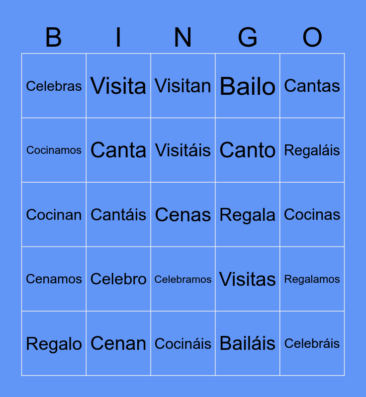 This bingo card has 25 words: Celebro, Cocináis, Visitáis, Regalo, Cantas, Celebras, Cocinamos, Visita, Regala, Celebramos, Canto, Cocinan, Visitas, Regalamos, Canta, Celebráis, Cocinas, Visitan, Regaláis, Cantáis, Cenas, Cenan, Cenamos, Bailo and Bailáis.