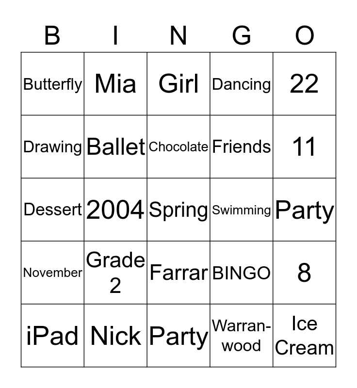 This bingo card has 25 words: Grade 2, Party, Chocolate, iPad, 22, Butterfly, Drawing, Mia, Swimming, Farrar, Friends, Dessert, BINGO, 8, Ballet, Ice Cream, Party, Girl, 11, 2004, Spring, Nick, November, Dancing and Warran- wood.