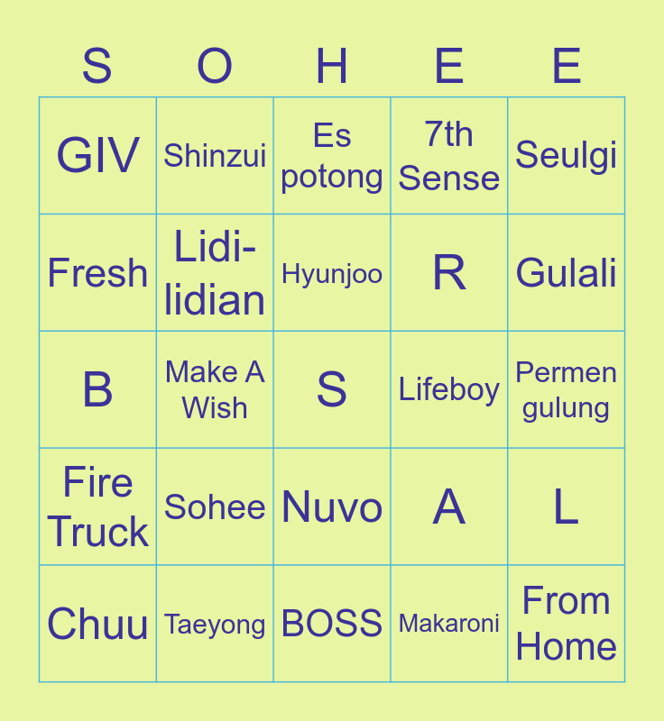 This bingo card has a free space and 24 words: Sohee, Taeyong, Hyunjoo, Chuu, Seulgi, GIV, Fresh, Shinzui, Lifeboy, Nuvo, R, B, A, L, Lidi-lidian, Makaroni, Permen gulung, Es potong, Gulali, Make A Wish, From Home, Fire Truck, 7th Sense and BOSS.