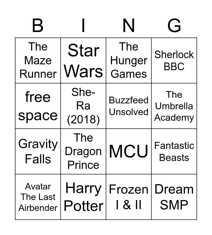 This bingo card has 16 words: Harry Potter, Fantastic Beasts, The Hunger Games, The Maze Runner, Gravity Falls, Star Wars, MCU, Frozen I & II, free space, She-Ra (2018), Avatar The Last Airbender, Sherlock BBC, The Dragon Prince, The Umbrella Academy, Buzzfeed Unsolved and Dream SMP.