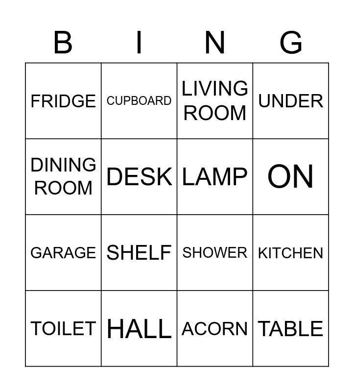 This bingo card has 20 words: KITCHEN, GARDEN, LIVING ROOM, BATHROOM, TOILET, DINING ROOM, HALL, FRIDGE, GARAGE, CUPBOARD, SHELF, SHOWER, DESK, TABLE, LAMP, IN, ON, UNDER, ACORN and BEDROOM.
