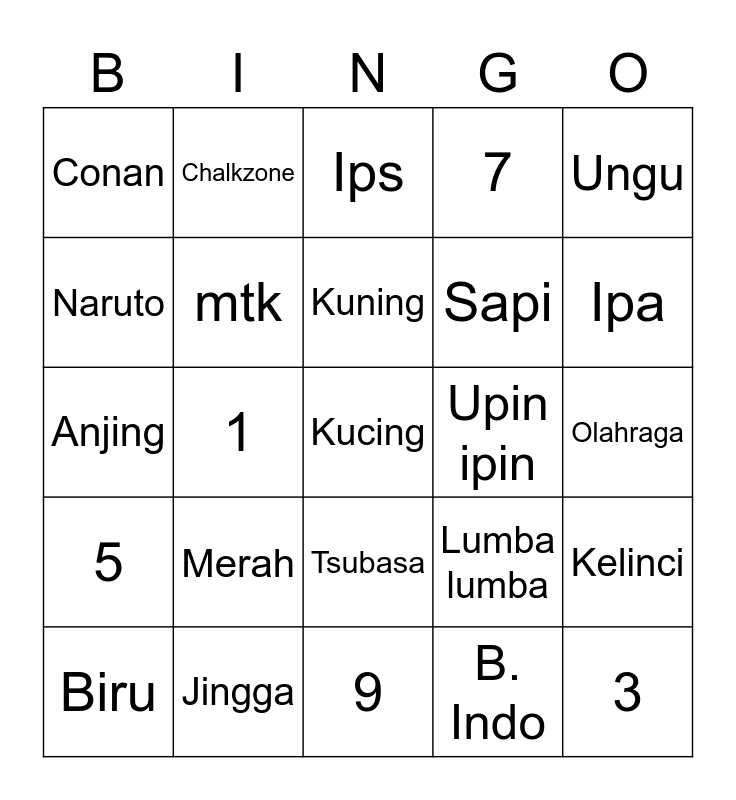This bingo card has a free space and 24 words: Merah, Jingga, Kuning, Biru, Ungu, Conan, Naruto, Chalkzone, Upin ipin, Tsubasa, Sapi, Anjing, Lumba lumba, Kelinci, mtk, B. Indo, Olahraga, Ips, Ipa, 1, 3, 5, 7 and 9.