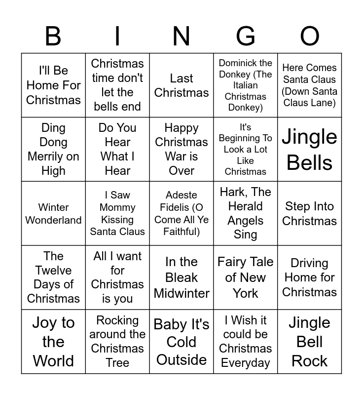 This bingo card has 51 words: Free!, Adeste Fidelis (O Come All Ye Faithful), All I Want For Christmas (Is My Two Front Teeth), Baby It's Cold Outside, All I want for Christmas is you, Blue Christmas, Christmas time don't let the bells end, Deck The Halls, Ding Dong Merrily on High, Do they know it's Christmas, Do You Hear What I Hear, Dominick the Donkey (The Italian Christmas Donkey), Driving Home for Christmas, Fairy Tale of New York, Frosty The Snowman, God Rest Ye Merry, Gentlemen, Happy Christmas War is Over, Hark, The Herald Angels Sing, Have Yourself A Merry Little Christmas, Here Comes Santa Claus (Down Santa Claus Lane), I Saw Mommy Kissing Santa Claus, I Wish it could be Christmas Everyday, I'll Be Home For Christmas, It's Beginning To Look a Lot Like Christmas, It's The Most Wonderful Time of the Year, Jingle Bell Rock, Jingle Bells, Jolly Old St. Nicholas / The Little Drummer Boy, Joy to the World, Last Christmas, Mary's Boy Child, Merry Christmas Everybody, Mistletoe and Wine, O Come All Ye Faithful, O Tannenbaum, Rocking around the Christmas Tree, Rudolph The Red-Nosed Reindeer, Santa Baby, Santa Claus Is Coming To Town, Silent Night, Step Into Christmas, The Twelve Days of Christmas, Twas The Night Before Christmas, Walking in the air, We Wish You A Merry Christmas, White Christmas, Winter Wonderland, Wombling Merry Christmas, Wonderful Christmastime, In the Bleak Midwinter and Good King Wenceslas.