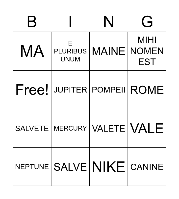This bingo card has 16 words: SALVE, VALE, MAINE, MA, SALVETE, E PLURIBUS UNUM, VALETE, NIKE, Free!, JUPITER, NEPTUNE, MIHI NOMEN EST, MERCURY, ROME, POMPEII and CANINE.