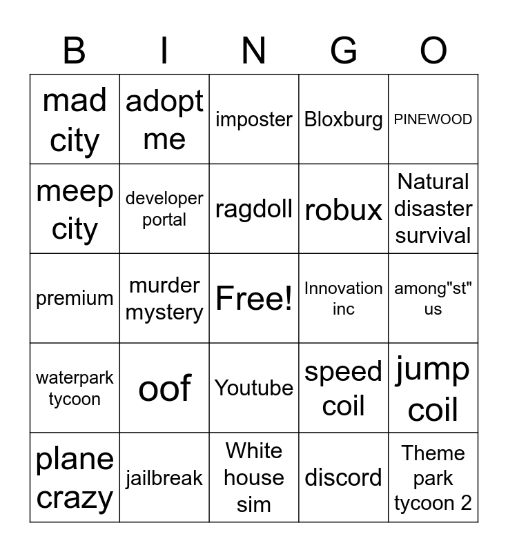 This bingo card has a free space and 24 words: oof, jailbreak, ragdoll, plane crazy, PINEWOOD, mad city, meep city, adopt me, Innovation inc, Youtube, robux, premium, speed coil, jump coil, developer portal, discord, among"st" us, imposter, Natural disaster survival, murder mystery, Theme park tycoon 2, waterpark tycoon, Bloxburg and White house sim.