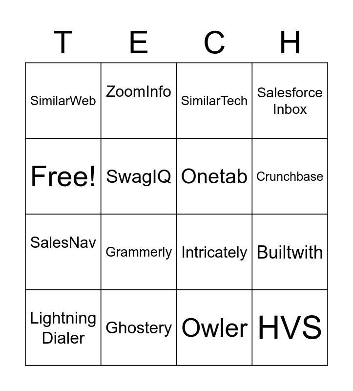 This bingo card has 16 words: Ghostery, Builtwith, SimilarTech, SimilarWeb, SalesNav, ZoomInfo, Intricately, Owler, Free!, SwagIQ, Lightning Dialer, Salesforce Inbox, Grammerly, Crunchbase, Onetab and HVS.