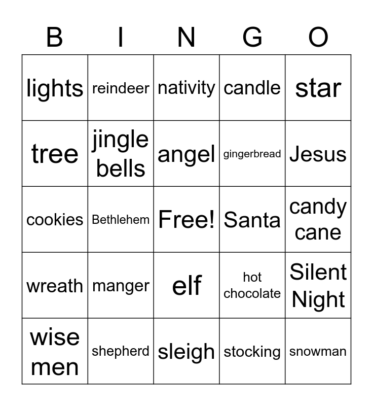 This bingo card has a free space and 24 words: manger, shepherd, angel, wise men, star, lights, tree, reindeer, Santa, elf, gingerbread, cookies, hot chocolate, Silent Night, jingle bells, stocking, candy cane, nativity, Jesus, Bethlehem, snowman, wreath, candle and sleigh.