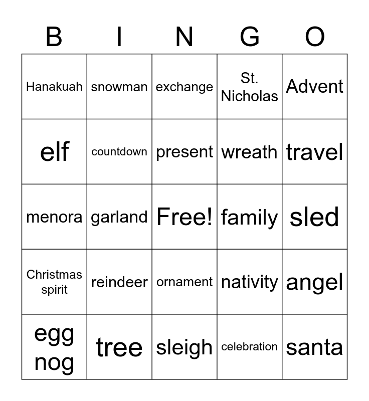 This bingo card has a free space and 24 words: reindeer, tree, present, egg nog, Advent, Hanakuah, elf, snowman, family, ornament, wreath, menora, nativity, angel, countdown, celebration, sled, exchange, travel, garland, santa, Christmas spirit, St. Nicholas and sleigh.