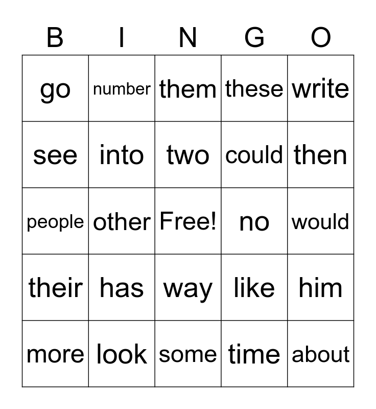 This bingo card has a free space and 24 words: has, look, two, more, write, go, see, number, no, way, could, people, like, him, into, time, would, them, then, other, about, their, these and some.
