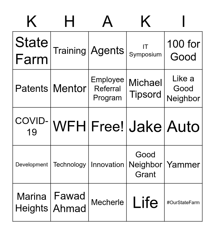 This bingo card has a free space and 29 words: Marina Heights, Ashley Pettit, WFH, Insurance, State Farm, Agents, Mentor, Technology, Jake, Fawad Ahmad, Auto, #OurStateFarm, Mecherle, Life, Like a Good Neighbor, Discount Double Check, Innovation, Development, 100 for Good, COVID-19, Good Neighbor Grant, Drive Safe and Save, Michael Tipsord, Patents, IT Symposium, Training, Yammer, Employee Referral Program and AWS.