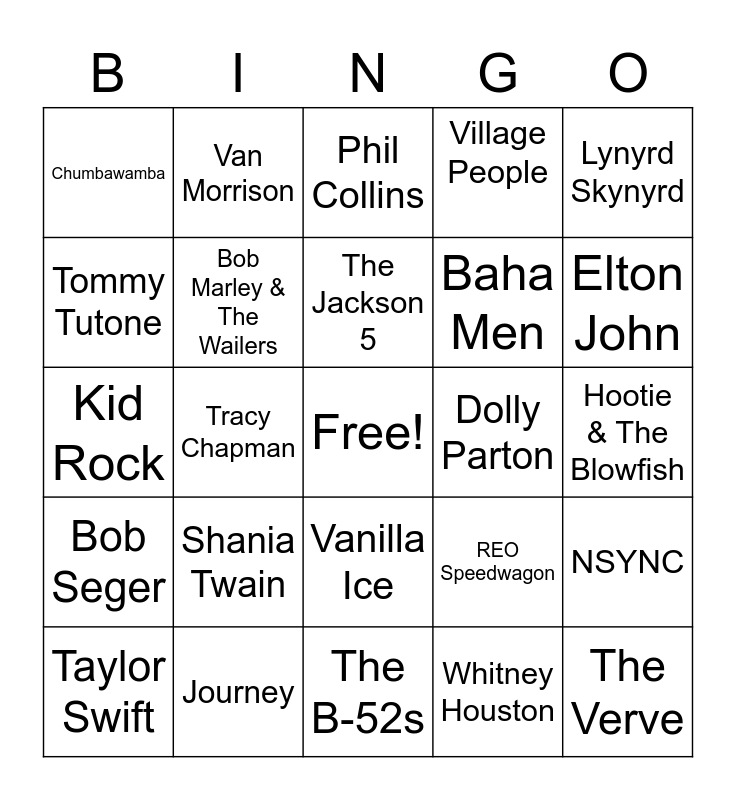 This bingo card has a free space and 59 words: Quad City DJ's, Journey, Michael Jackson, Bob Seger, Whitney Houston, Aretha Franklin, Bob Marley & The Wailers, Neil Diamond, Baha Men, The Beach Boys, Village People, Will Smith, Tommy Tutone, Sam Hunt, Rick Springfield, Chumbawamba, The Verve, Lynyrd Skynyrd, Johnny Cash, The Jackson 5, Dolly Parton, Phil Collins, Taylor Swift, NSYNC, Marvin Gaye, Chris Stapleton, Adele, Billy Joel, Elton John, Justin Bieber, Hanson, The Beatles, Queen, Steve Miller Band, Van Morrison, John Mellencamp, Lil Nas X, Tracy Chapman, Tom Petty, Kid Rock, Santana/ Rob Thomas, Shania Twain, Hootie & The Blowfish, Jimmy Buffett, Carly Rae Jepsen, Celine Dion, John Travolta/Olivia Newton-John, Flo Rida, Vanilla Ice, The B-52s, Billy Ray Cyrus, Theme From "Friends", Cyndi Lauper, Fleetwood Mac, TOTO, REO Speedwagon, MC Hammer, Bee Gees and Bruce Springsteen.