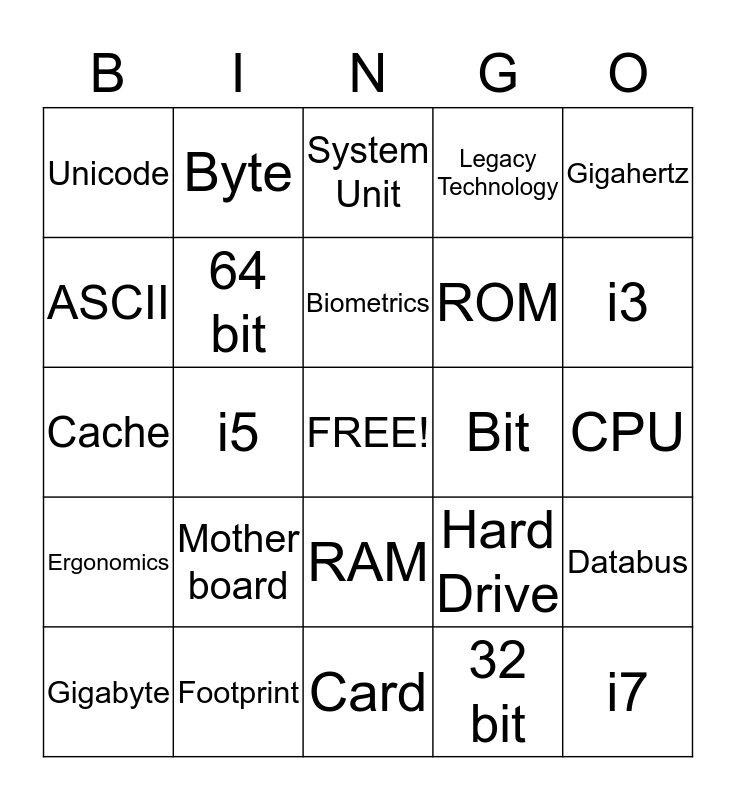 This bingo card has a free space and 24 words: Mother board, Footprint, Biometrics, Gigabyte, Gigahertz, Unicode, ASCII, Byte, Bit, RAM, ROM, Cache, Hard Drive, Databus, 64 bit, 32 bit, CPU, System Unit, i3, i5, i7, Ergonomics, Legacy Technology and Card.