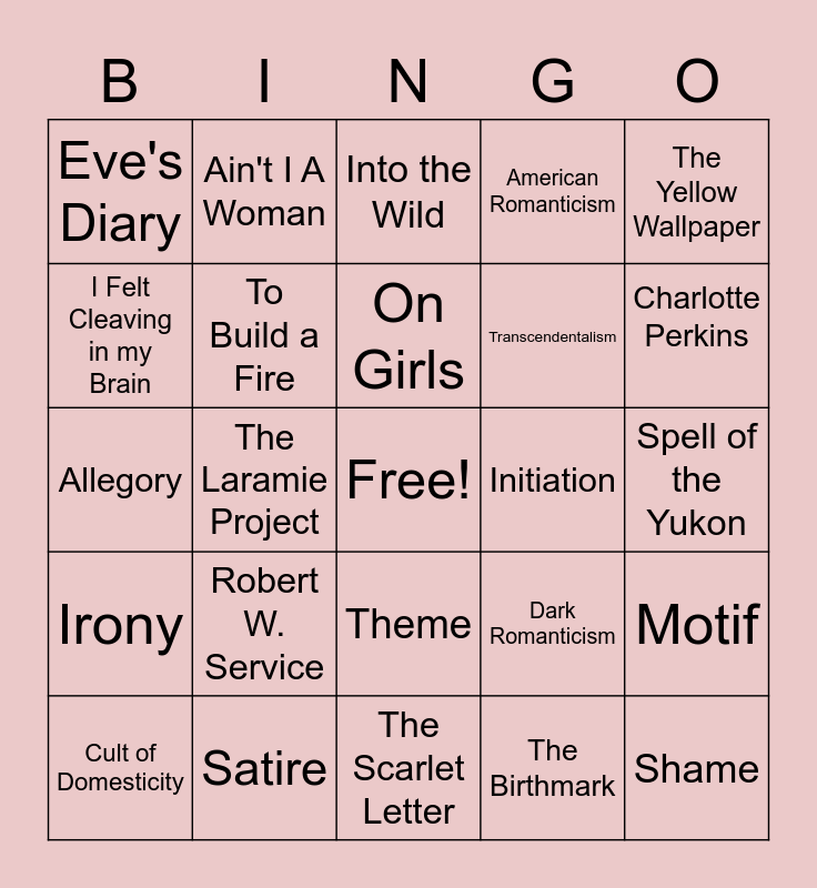 This bingo card has a free space and 24 words: Robert W. Service, Satire, On Girls, Cult of Domesticity, The Yellow Wallpaper, Eve's Diary, I Felt Cleaving in my Brain, Ain't I A Woman, Initiation, Theme, Transcendentalism, Allegory, Dark Romanticism, Motif, To Build a Fire, The Birthmark, Spell of the Yukon, Into the Wild, Charlotte Perkins, The Laramie Project, Shame, Irony, American Romanticism and The Scarlet Letter.