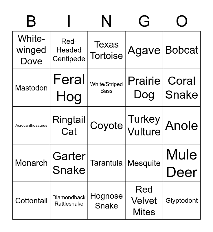 This bingo card has a free space and 24 words: Garter Snake, Diamondback Rattlesnake, White/Striped Bass, Cottontail, Bobcat, White-winged Dove, Mastodon, Red-Headed Centipede, Turkey Vulture, Tarantula, Prairie Dog, Acrocanthosaurus, Mesquite, Mule Deer, Feral Hog, Red Velvet Mites, Anole, Texas Tortoise, Coral Snake, Ringtail Cat, Glyptodont, Monarch, Agave and Hognose Snake.