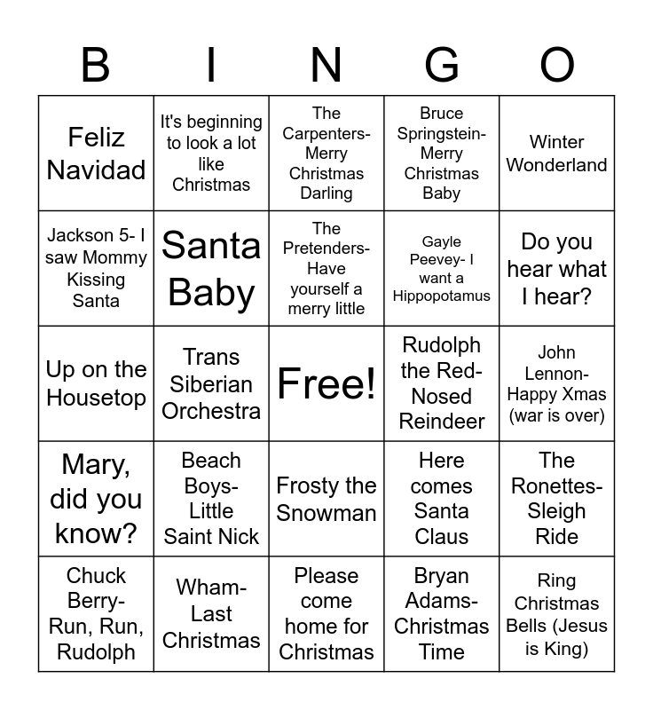 This bingo card has a free space and 24 words: Beach Boys- Little Saint Nick, Wham-Last Christmas, The Pretenders-Have yourself a merry little, Chuck Berry-Run, Run, Rudolph, Winter Wonderland, Feliz Navidad, Jackson 5- I saw Mommy Kissing Santa, It's beginning to look a lot like Christmas, Rudolph the Red-Nosed Reindeer, Frosty the Snowman, Gayle Peevey- I want a Hippopotamus, Up on the Housetop, Here comes Santa Claus, The Ronettes- Sleigh Ride, Santa Baby, Bryan Adams- Christmas Time, John Lennon- Happy Xmas (war is over), The Carpenters- Merry Christmas Darling, Do you hear what I hear?, Trans Siberian Orchestra, Ring Christmas Bells (Jesus is King), Mary, did you know?, Bruce Springstein- Merry Christmas Baby and Please come home for Christmas.