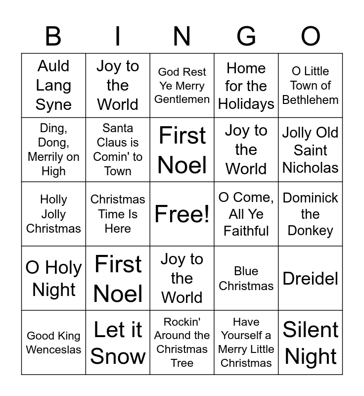 ⚠ This card has duplicate items: Holly Jolly Christmas (2), Let it Snow (2), Joy to the World (5), Silver Bells (2), Feliz Navidad (2), Carol of the Bells (2), Winter Wonderland (2), All I Want for Christmas is You (2), Sleigh Ride (2), Jingle Bells (2), Little Drummer Boy (2), Dreidel (2), Dominick the Donkey (2), Frosty the Snowman (3), First Noel (2), Silent Night (2), Grandma Got Runover by a Reindeer (2), Jingle Bell Rock (2), Have Yourself a Merry Little Christmas (2), Rockin' Around the Christmas Tree (2), Do You Hear What I Hear (2)