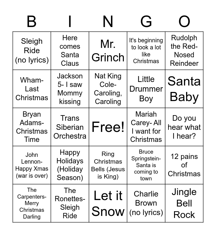 This bingo card has a free space and 24 words: Happy Holidays (Holiday Season), The Ronettes- Sleigh Ride, Nat King Cole- Caroling, Caroling, The Carpenters-Merry Christmas Darling, Rudolph the Red-Nosed Reindeer, Sleigh Ride (no lyrics), Wham- Last Christmas, Here comes Santa Claus, Mariah Carey- All I want for Christmas, Ring Christmas Bells (Jesus is King), Little Drummer Boy, Bryan Adams- Christmas Time, Bruce Springstein-Santa is coming to town, 12 pains of Christmas, Jackson 5- I saw Mommy kissing, Charlie Brown (no lyrics), Do you hear what I hear?, Mr. Grinch, Santa Baby, Trans Siberian Orchestra, Jingle Bell Rock, John Lennon-Happy Xmas (war is over), It's beginning to look a lot like Christmas and Let it Snow.