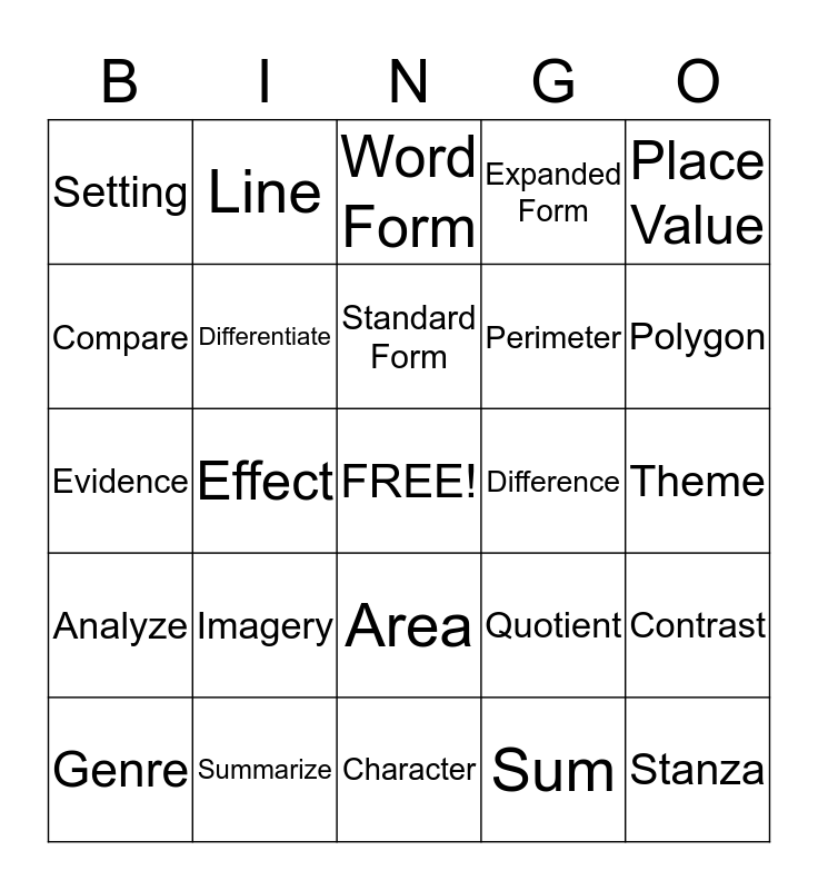 This bingo card has a free space and 24 words: Imagery, Summarize, Standard Form, Genre, Place Value, Setting, Compare, Line, Difference, Area, Perimeter, Evidence, Quotient, Contrast, Differentiate, Sum, Theme, Word Form, Polygon, Effect, Stanza, Analyze, Expanded Form and Character.
