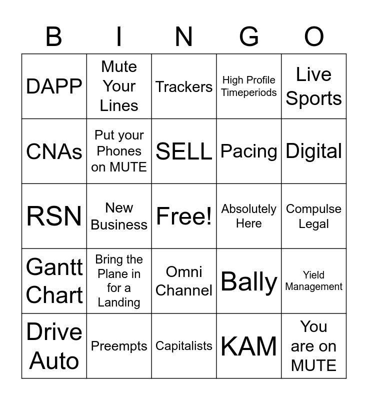 This bingo card has a free space and 24 words: Bring the Plane in for a Landing, Preempts, SELL, Drive Auto, Live Sports, DAPP, CNAs, Mute Your Lines, Absolutely Here, Omni Channel, Pacing, RSN, Bally, Yield Management, Put your Phones on MUTE, KAM, Compulse Legal, Trackers, Digital, New Business, You are on MUTE, Gantt Chart, High Profile Timeperiods and Capitalists.