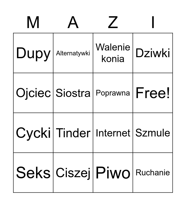 This bingo card has 17 words: Piwo, Seks, Walenie konia, Dupy, Tinder, Dziwki, Szmule, Poprawna, Free!, Siostra, Ciszej, Internet, Ojciec, Alternatywki, Cycki, Była and Ruchanie.