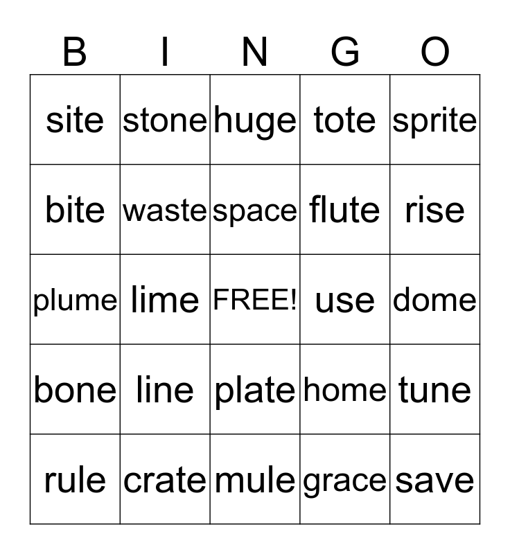This bingo card has a free space and 26 words: plate, grace, space, crate, sprite, site, bite, stone, dome, home, flute, plume, tune, rule, lime, time, tote, bone, huge, save, rise, mule, use, line, waste and game.