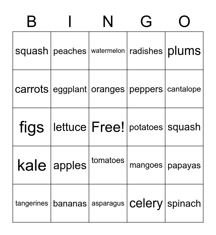 This bingo card has a free space and 24 words: apples, bananas, oranges, tangerines, plums, squash, carrots, peaches, potatoes, tomatoes, peppers, figs, mangoes, papayas, eggplant, celery, squash, watermelon, cantalope, lettuce, spinach, kale, radishes and asparagus.