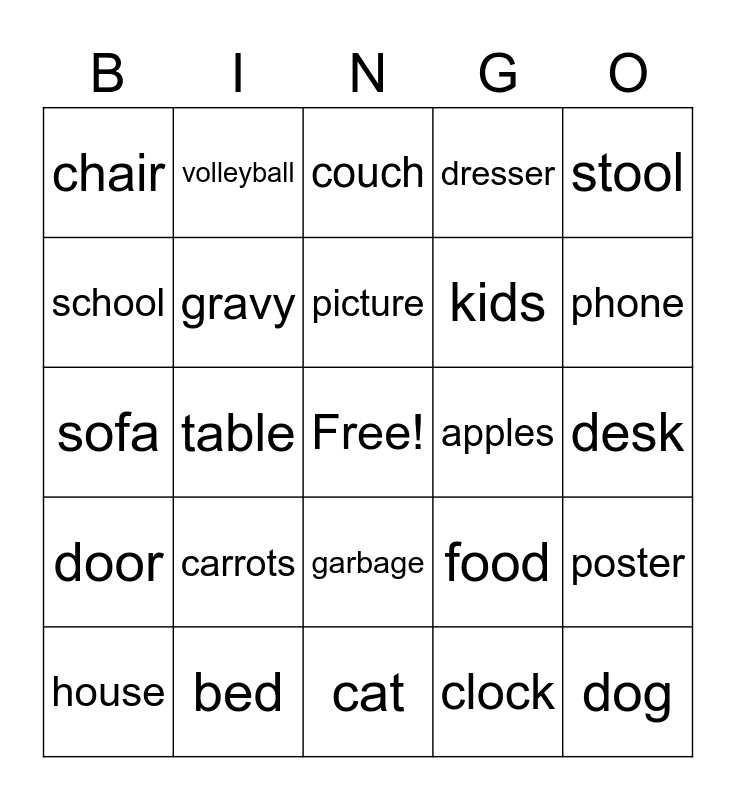 This bingo card has a free space and 29 words: house, thing, table, counter, chair, couch, gravy, carrots, apples, bed, desk, dog, cat, clock, phone, watch, garbage, door, stool, sofa, food, students, kids, school, dresser, volleyball, poster, picture and pillow.