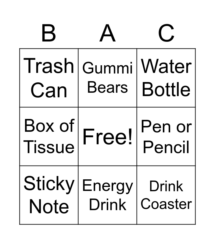 This bingo card has a free space and 8 words: Pen or Pencil, Water Bottle, Gummi Bears, Sticky Note, Trash Can, Drink Coaster, Box of Tissue and Energy Drink.