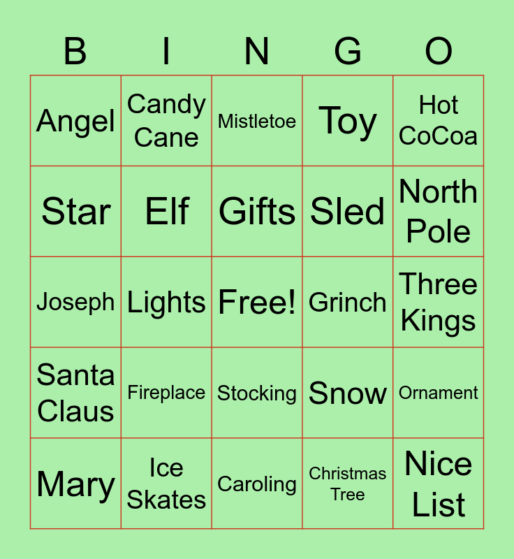 This bingo card has a free space and 32 words: Christmas Tree, Gingerbread, Lights, Cookie, Santa Claus, Elf, Hot CoCoa, Ornament, Candy Cane, Jesus, Gifts, Mistletoe, Reef, Reindeer, Grinch, Snow Globe, Mary, Joseph, Stocking, Fireplace, Snow, Snowman, Three Kings, Ice Skates, Nice List, Toy, Sled, Star, Angel, Caroling, Bells and North Pole.