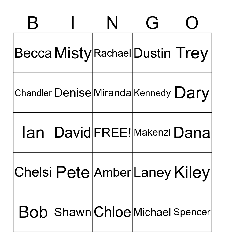 This bingo card has a free space and 29 words: Bob, Louise, David, Susan, Becca, Rachael, Denise, Pete, Makenzi, Shawn, Dana, Spencer, Chloe, Michael, Dary, Dianne, Amber, Chelsi, Trey, Ian, Laney, Camden, Kennedy, Chandler, Dustin, Misty, Kiley, Miranda and Jackson.