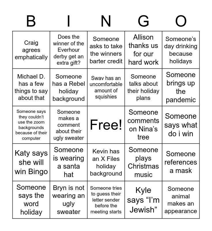 This bingo card has a free space and 25 words: Someone is wearing a santa hat, Someone tries to guess their letter sender before the meeting starts, Swav has an uncomfortable amount of squishies, Someone says the word holiday, Someone’s day drinking because holidays, Craig agrees emphatically, Michael D. has a few things to say about that, Does the winner of the Everhour derby get an extra gift?, Someone comments on Nina’s tree, Kevin has an X Files holiday background, Someone talks about their holiday plans, Someone says they couldn’t use the zoom backgrounds because of their computer, Someone plays Christmas music, Someone references a mask, Someone has a Rebel holiday background, Someone says this year was different, Someone says what do i win, Someone asks to take the winners barter credit, Someone brings up the pandemic, Someone makes a comment about their ugly sweater, Someone animal makes an appearance, Bryn is not wearing an ugly sweater, Katy says she will win Bingo, Allison thanks us for our hard work and Kyle says “I’m Jewish”.