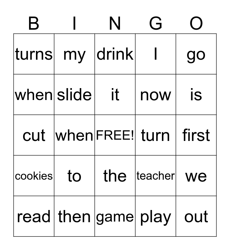 This bingo card has a free space and 24 words: to, then, it, read, go, turns, when, my, turn, the, now, cut, teacher, we, slide, play, first, drink, is, when, out, cookies, I and game.
