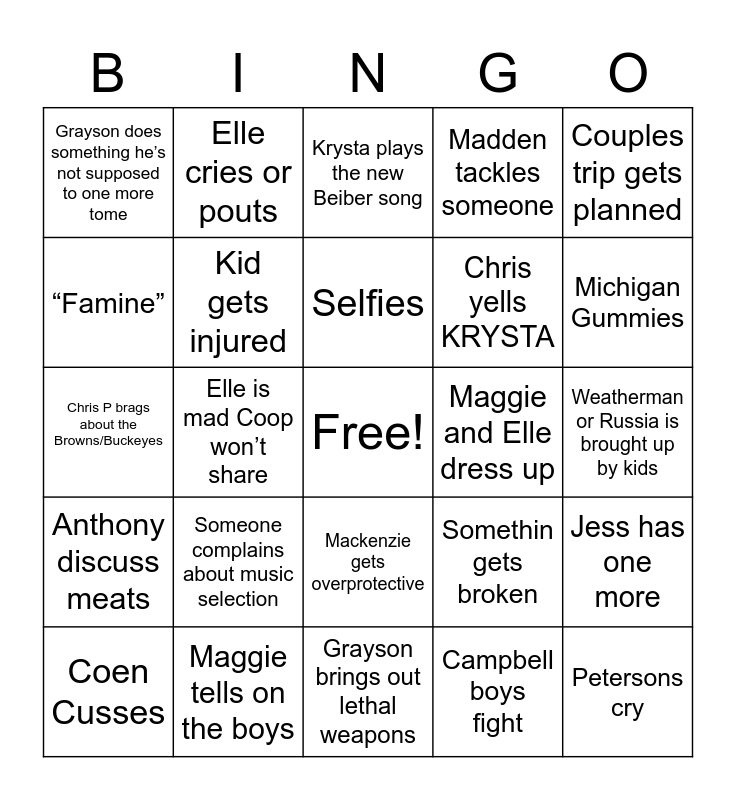 This bingo card has a free space and 24 words: Someone complains about music selection, Maggie tells on the boys, Selfies, Coen Cusses, Couples trip gets planned, Grayson does something he’s not supposed to one more tome, “Famine”, Elle cries or pouts, Maggie and Elle dress up, Mackenzie gets overprotective, Chris yells KRYSTA, Chris P brags about the Browns/Buckeyes, Somethin gets broken, Jess has one more, Kid gets injured, Campbell boys fight, Weatherman or Russia is brought up by kids, Krysta plays the new Beiber song, Michigan Gummies, Elle is mad Coop won’t share, Petersons cry, Anthony discuss meats, Madden tackles someone and Grayson brings out lethal weapons.