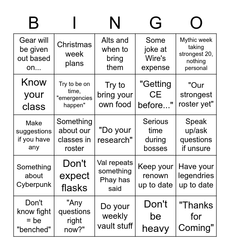This bingo card has a free space and 24 words: Don't know fight = be "benched", Don't expect flasks, Try to bring your own food, Don't be heavy, Mythic week taking strongest 20, nothing personal, Gear will be given out based on..., Christmas week plans, Alts and when to bring them, Serious time during bosses, Speak up/ask questions if unsure, Make suggestions if you have any, Try to be on time, "emergencies happen", Keep your renown up to date, Have your legendries up to date, Know your class, "Any questions right now?", Do your weekly vault stuff, Some joke at Wire's expense, "Our strongest roster yet", Something about Cyberpunk, Something about our classes in roster, Val repeats something Phay has said, "Getting CE before..." and "Thanks for Coming".