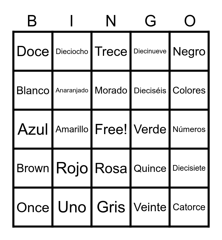 This bingo card has a free space and 24 words: Rojo, Uno, Morado, Once, Negro, Doce, Blanco, Dieciocho, Verde, Rosa, Dieciséis, Azul, Quince, Diecisiete, Anaranjado, Veinte, Números, Trece, Colores, Amarillo, Catorce, Brown, Diecinueve and Gris.
