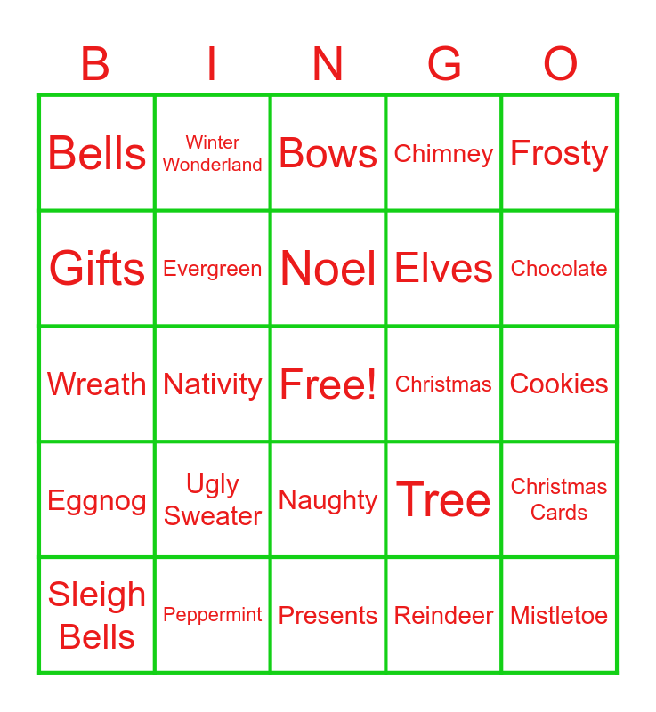 This bingo card has a free space and 44 words: Mrs Clause, Mistletoe, Happy Holidays, Sleigh Bells, Yule Log, Reindeer, Bows, Tinsel, Frosty, Peppermint, Chimney, Christmas, Naughty, Ugly Sweater, Blitzen, Presents, Jingle Bells, Wreath, Manger, Chocolate, Winter Wonderland, Kris Kringle, Decorations, Bells, Wise Men, Cookies, Holly, Candy Cane, Tree, Eggnog, Rudolph, Christmas Cards, Grinch, Santa, Nativity, Secret Santa, Holy, Gingerbread, Noel, Gifts, Elves, Garland, Evergreen and Sugarplum.