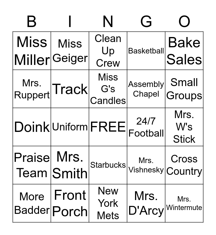 This bingo card has a free space and 24 words: Mrs. Smith, Front Porch, Miss G's Candles, More Badder, Bake Sales, Miss Miller, Mrs. Ruppert, Miss Geiger, 24/7 Football, Starbucks, Assembly Chapel, Doink, Mrs. Vishnesky, Cross Country, Track, Mrs. D'Arcy, Mrs. W's Stick, Clean Up Crew, Small Groups, Uniform, Mrs. Wintermute, Praise Team, Basketball and New York Mets.