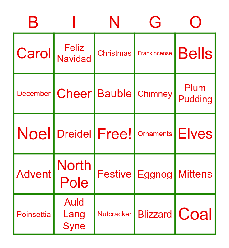 This bingo card has a free space and 26 words: Advent, Auld Lang Syne, Bauble, Blizzard, Bells, Carol, Cheer, Christmas, Chimney, Coal, December, Dreidel, Druid, Eggnog, Elves, Father Christmas, Feliz Navidad, Festive, Frankincense, Mittens, Noel, North Pole, Nutcracker, Ornaments, Plum Pudding and Poinsettia.