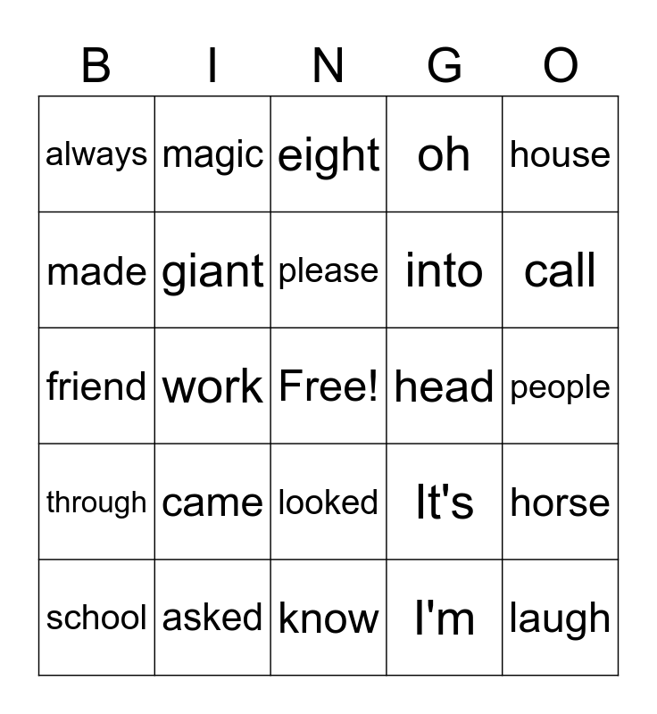 This bingo card has a free space and 24 words: came, asked, please, school, house, always, made, magic, head, looked, into, friend, It's, horse, giant, I'm, people, eight, call, work, laugh, through, oh and know.