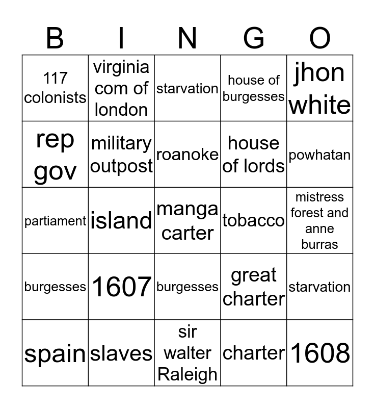 This bingo card has 25 words: 1607, sir walter Raleigh, roanoke, spain, jhon white, 117 colonists, rep gov, virginia com of london, tobacco, burgesses, house of lords, partiament, great charter, starvation, military outpost, 1608, mistress forest and anne burras, starvation, powhatan, island, manga carter, slaves, burgesses, house of burgesses and charter.