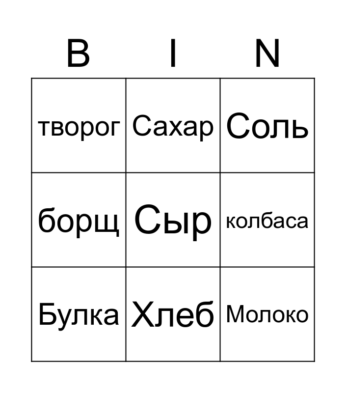 This bingo card has a free space and 11 words: Орехи, Хлеб, Молоко, Булка, Сахар, Соль, колбаса, Мясо, борщ, творог and бублик.