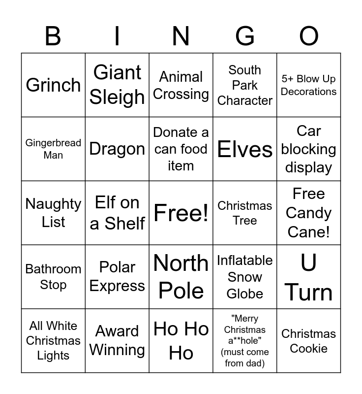 This bingo card has a free space and 24 words: Polar Express, Award Winning, Donate a can food item, All White Christmas Lights, 5+ Blow Up Decorations, Grinch, Gingerbread Man, Giant Sleigh, Christmas Tree, North Pole, Elves, Naughty List, Inflatable Snow Globe, U Turn, Dragon, "Merry Christmas a**hole" (must come from dad), Free Candy Cane!, Animal Crossing, Car blocking display, Elf on a Shelf, Christmas Cookie, Bathroom Stop, South Park Character and Ho Ho Ho.