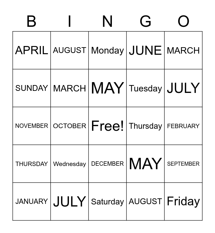 This bingo card has a free space and 24 words: Wednesday, JULY, MAY, JANUARY, MARCH, APRIL, SUNDAY, AUGUST, Thursday, DECEMBER, Tuesday, NOVEMBER, MAY, SEPTEMBER, MARCH, AUGUST, FEBRUARY, Monday, JULY, OCTOBER, Friday, THURSDAY, JUNE and Saturday.