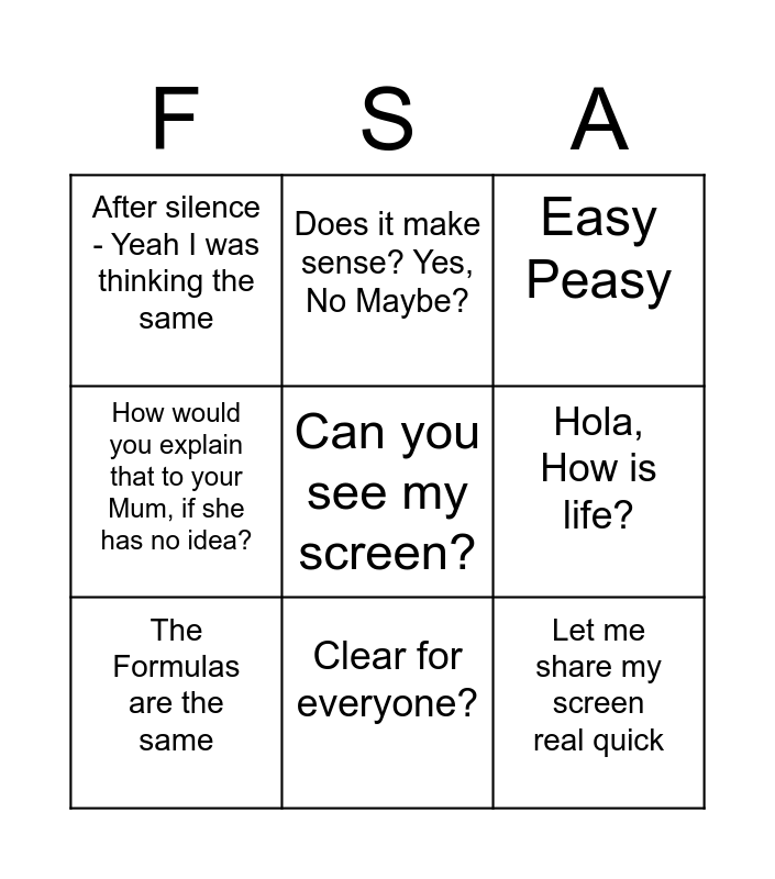 This bingo card has a free space and 8 words: Hola, How is life?, Easy Peasy, Does it make sense? Yes, No Maybe?, The Formulas are the same, After silence - Yeah I was thinking the same, Let me share my screen real quick, How would you explain that to your Mum, if she has no idea? and Clear for everyone?.